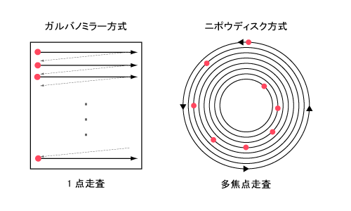 共焦点レーザー顕微鏡の走査方式は主にガルバノミラー方式と二ポウディスク方式の2つがある。以下に2つの方式について述べる。