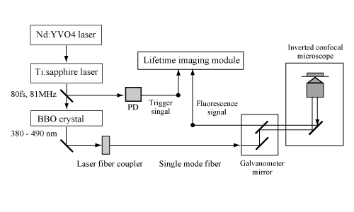 FLIMシステムの構成例を図1に示す。ここでは時間領域測定法を用いてFLIMシステムが構築されている。