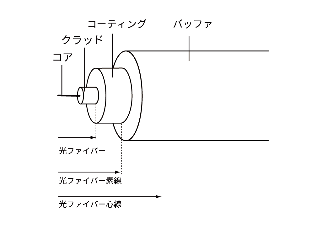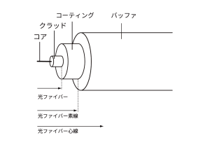 光ファイバーは被覆の有無によって、光ファイバー素線、光ファイバー心線と呼び方が代わる。光ファイバーの典型的な構造を図に示す。