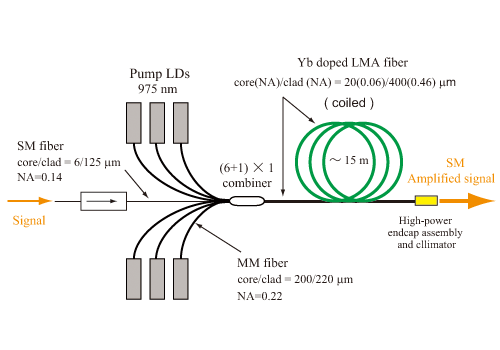 光ファイバー中を伝搬するレーザー光の高出力化に伴い、光ファイバー内での誘導ラマン散乱(SRS)や誘導ブリルアン散乱(SBS)といった非線形光学効果が起こりやすくなる。これが高出力ファイバーレーザーの特性を制限する。この非線形光学現象を避けるためにはコア径の大きな光ファイバーか短尺の光ファイバーが必要である。しかしファイバー長を短くすると、相互作用長が短くなり、ファイバーレーザーの効率が低下してしまう。よって、高効率を維持しながら非線形光学現象を抑えるためにはモードエリア(モードフィールド)が大きな光ファイバーが必要となる。そこで開発されたのが、低NA・大口径化された大モード面積(Large Mode Area : LMA)ファイバーである[1-3]。LMAファイバーはその開発の経緯からも分かるように、多くの場合ダブルクラッドファイバー(DCF)である。