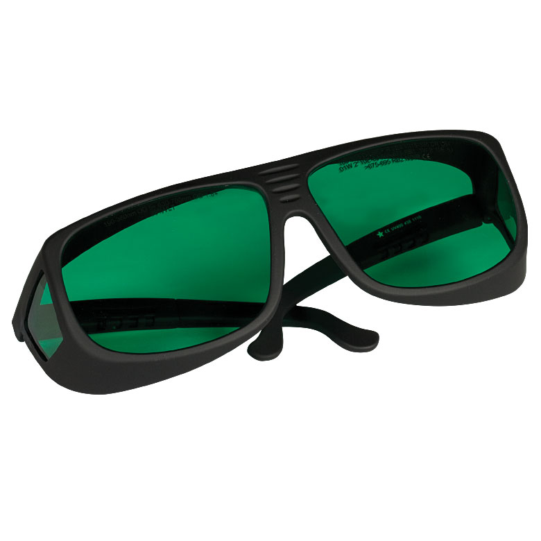 レーザー保護メガネの役割は”通常の散乱光からの保護”と”万一誤ってレーザービームが直接照射されるような事態が発生した場合にその状態から回避する時間内での保護”の二つに分けることができる。前者のレーザー保護メガネには、側面からのレーザーの進入を考慮した側面シールドつき枠に、プラスチック製吸収フィルタを装着したものや、ゴーグルタイプが対応する。一般的には軽量かつ比較的視野角の広いサングラスタイプのものが使われる。後者のレーザー保護メガネには、直接暴露光を前提とした堅牢なつくりの枠に、飛散防止を施したガラスフィルタを装着したものが対応する。両者のレンズフィルタはレーザーを遮光する光学濃度が同じであっても、直接レーザーに暴露した場合は後者のタイプのものが有利である。