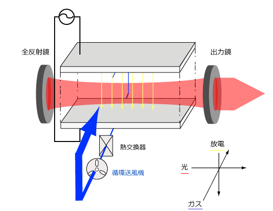 放電を何回も繰り返すとガスが劣化し、ガスの反応が鈍ってくる。そこでガスが劣化しないように高速でフレッシュガスを循環させ、発振の効率を上げる。これを高速軸流型のCO2レーザーという。高出力発振器はこの方式を取っている。