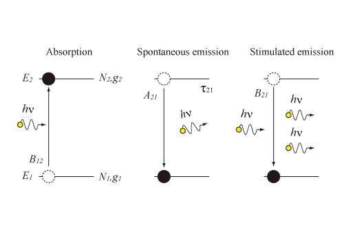 図1 吸収(absorption)、自然放出(spontaneous emission)、誘導放出(stimulated emission)