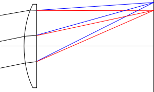 単レンズの場合、赤と青の焦点距離の差は、焦点距離の2%程度である。