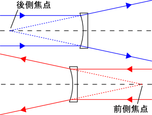 レンズの焦点は、前と後ろそれぞれにあり、2点存在する。図2で、レンズの前方に無限遠の光を入れた時、光が集光する点を後側焦点(a)、レンズ後方から無限遠の光を入れた時に、光が集光する点を前側焦点(b)という。逆に前側焦点から出た光は、レンズを通ると平行に進むことになる(c)。